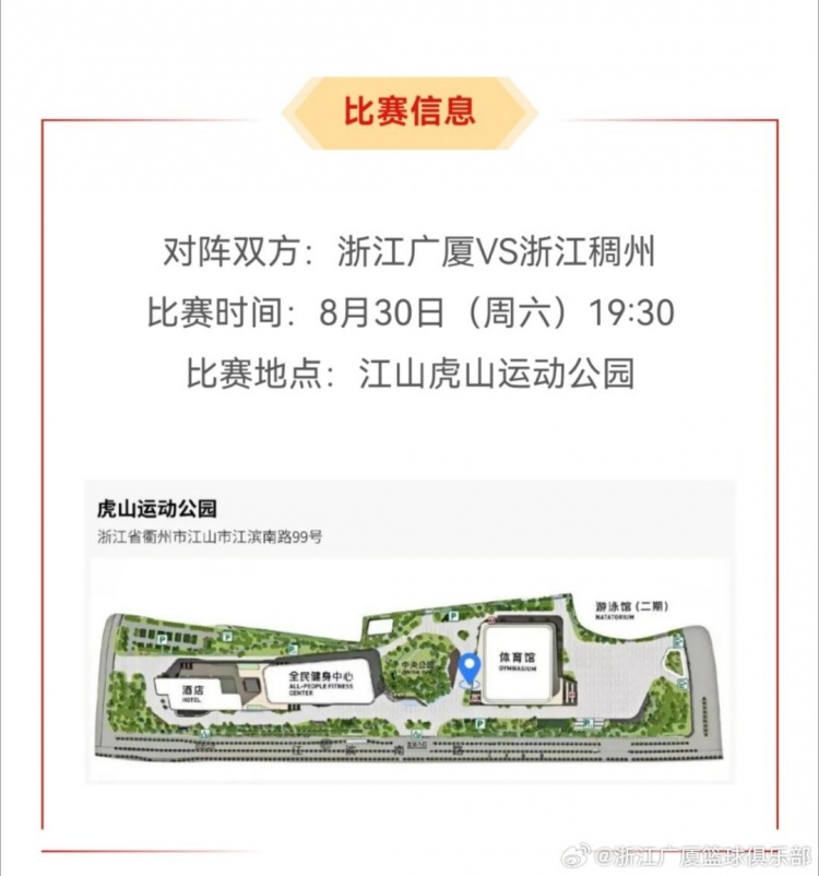 比赛将于8月30日19点半在浙江省江山市虎山运动公园体育馆进行,这也是两队休赛期的首秀。