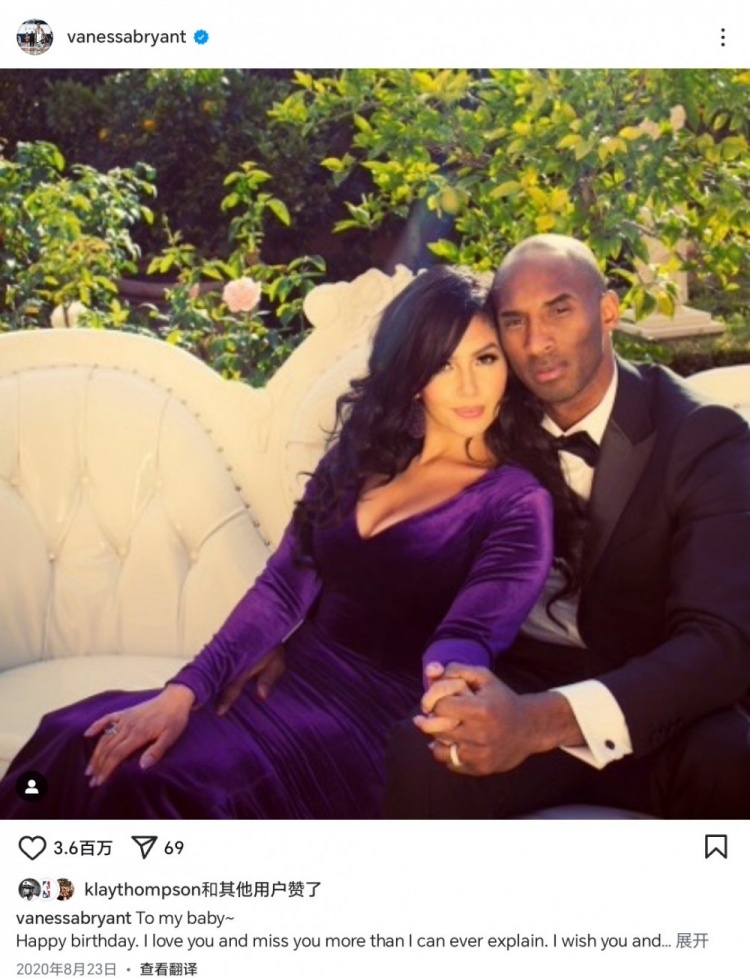 瓦妮莎社媒祝科比生日快乐:我们非常爱&想念你和Gigi
