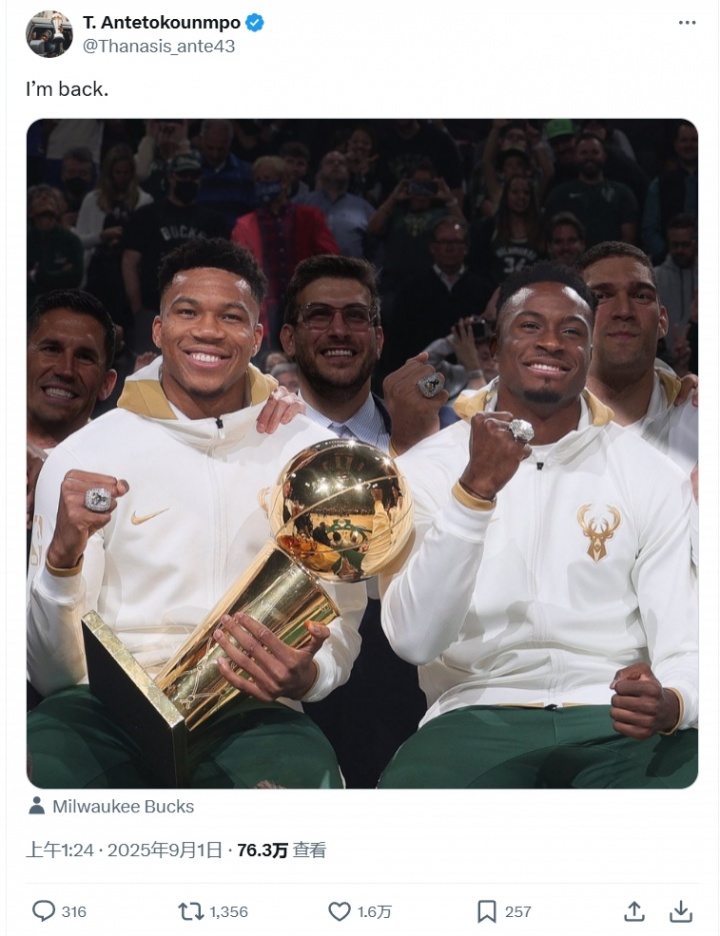 字母哥哥自宣重返雄鹿 借用乔丹经典名言:I'm Back!