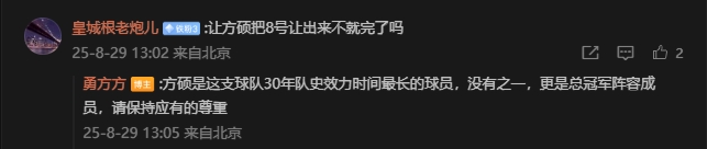 有球迷提议让方硕让出8号球衣,勇方方表示:“方硕是这支球队30年队史效力时间最长的球员,没有之一,更是总冠军阵容成员,请保持应有的尊重。”