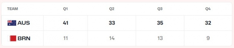 本场比赛从首节就一边倒,首节结束时澳大利亚队领先30分,半场结束时分差进一步扩大,来到49分,三节结束时分差继续拉大,来到71分。