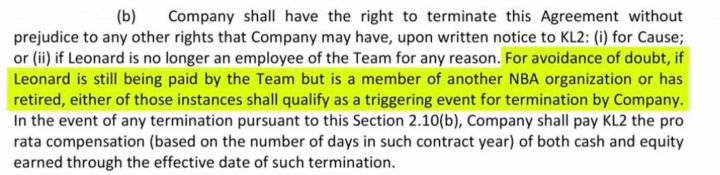 据了解,披露的文件显示,双方签下的协议中规定,莱昂纳德必须一直留在快船才能拿走全部的2800万美元,如果换队或退役合同将提前终止。