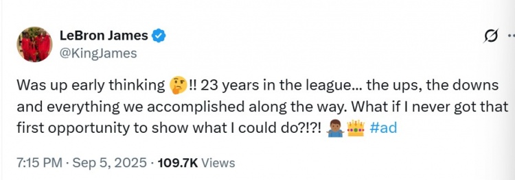 詹姆斯在19点15更推道:“清晨醒来,思绪万千🤔!!在联盟的23年里,我经历了起起伏伏,也收获了无数成就。如果当初没有那个展示自己的机会,一切又会怎样呢🤷🏾‍♂️👑?(广告)”