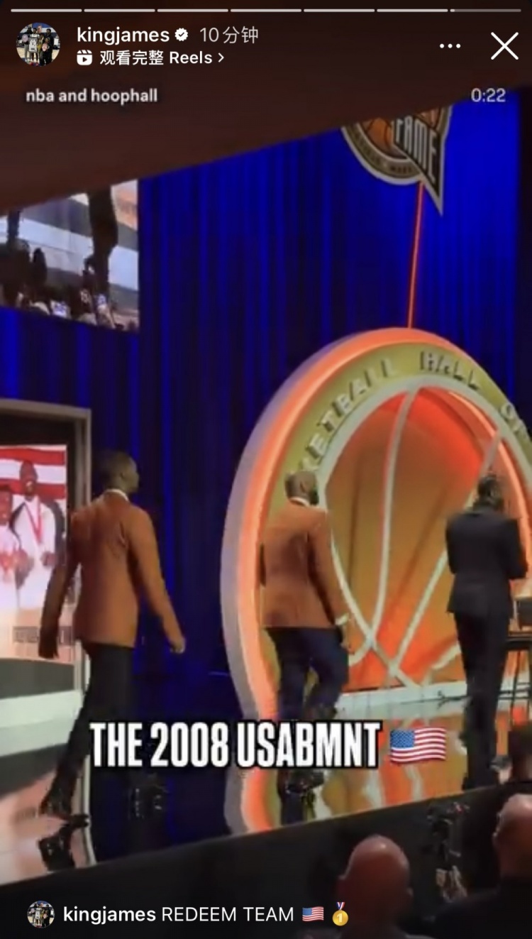 詹姆斯又转发了他与“救赎之队”全队正式在名人堂现场登台接受表彰的视频,并评论道:“救赎之队🇺🇸🥇”
