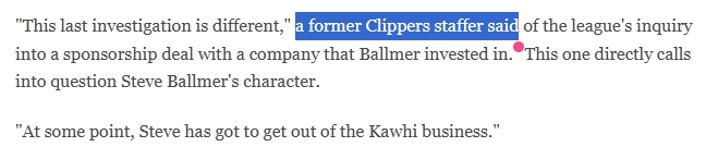 一位前快船员工表示:“这次(联盟调查)和之前不同,这次直接质疑了鲍尔默的品格。总有一天,鲍尔默必须与莱昂纳德切割。”