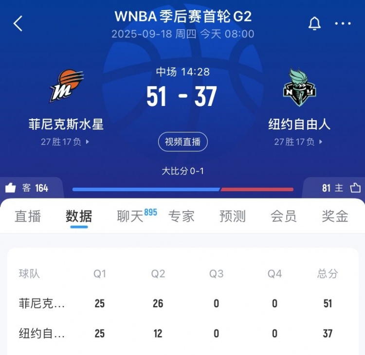 9月18日讯 WNBA季后赛首轮G2,纽约自由人半场37-51落后菲尼克斯水星。