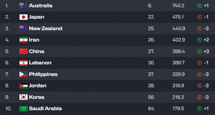 中国队排名第27,上升了3位。