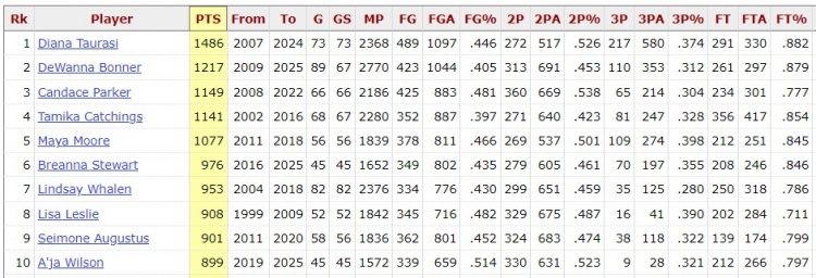 加上今天的38分,威尔逊季后赛生涯总得分来到937分,连超两人,升至WNBA季后赛历史得分榜第8位。