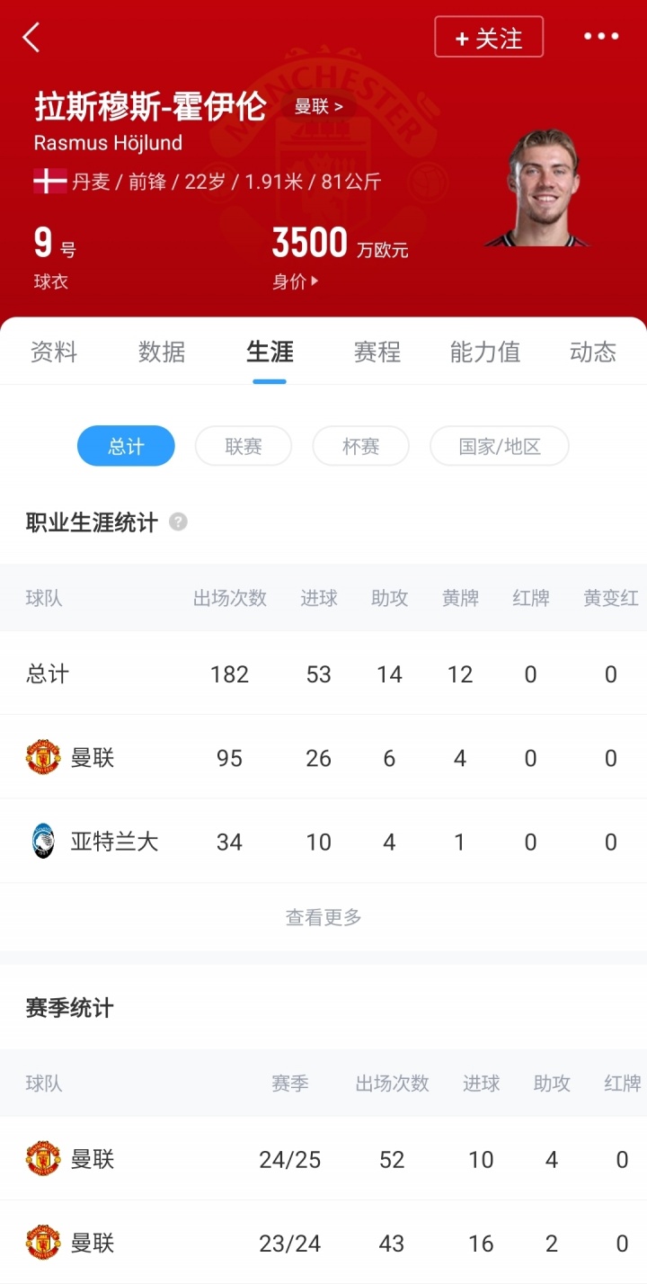 霍伊伦现年22岁,曼联2023年夏天花费7780万欧从亚特兰大引进霍伊伦。在曼联的两个赛季,霍伊伦共代表球队出战95场比赛,贡献26球6助攻。目前,霍伊伦的德转身价为3500万欧。