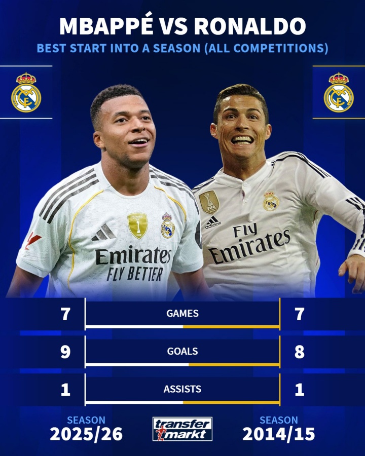 姆巴佩、梅西、C罗最佳赛季的开局对比:
