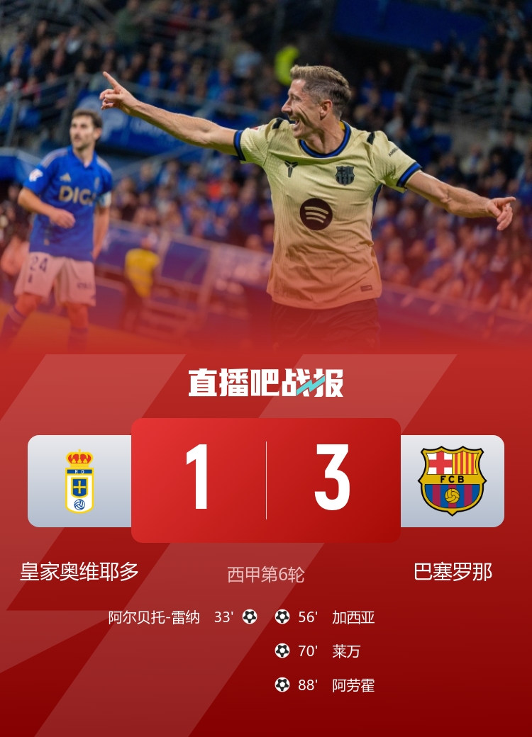 西甲第6轮比赛,拉什福德助攻阿劳霍破门,帮助巴萨客场3-1击败皇家奥维耶多。