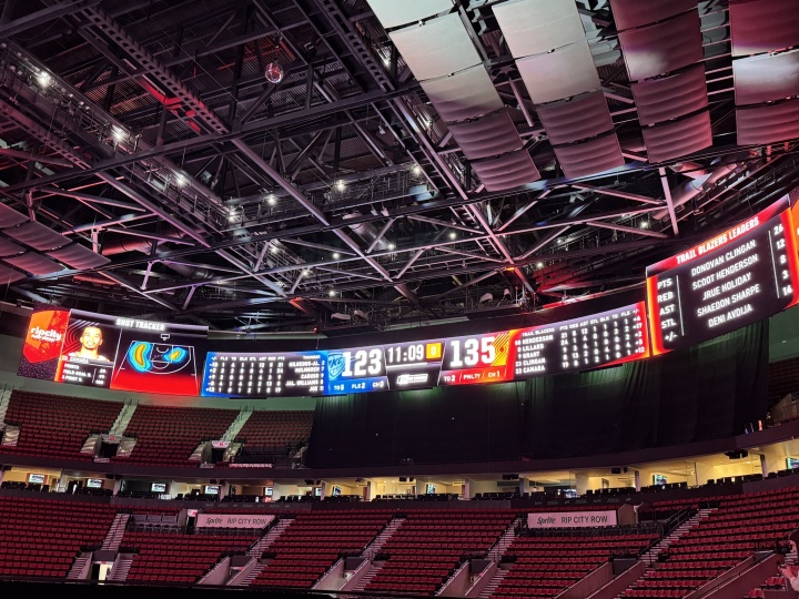 开拓者主场摩达中心近日公布了全新的中场大屏幕以及球场周边曲面屏的升级。