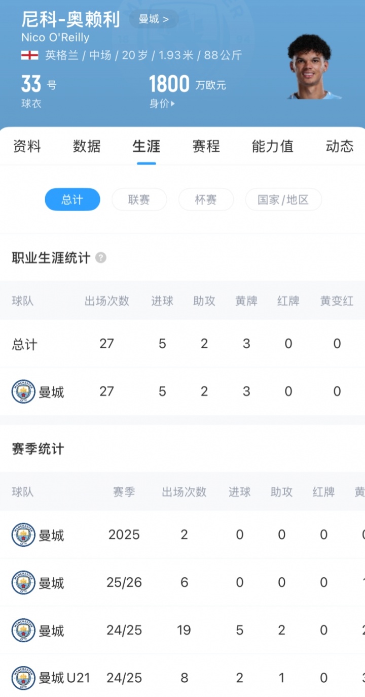奥赖利现年20岁,身高1米93司职中场,现德转估值1800万欧,新赛季至今他各赛事为曼城出场8次。