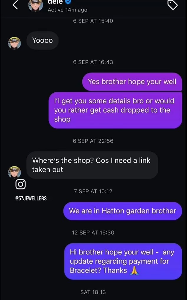 根据他与阿里之间后来发布又删除的聊天记录显示,这笔欠款与阿里在伦敦市中心哈顿花园地区购买的一条手链有关。