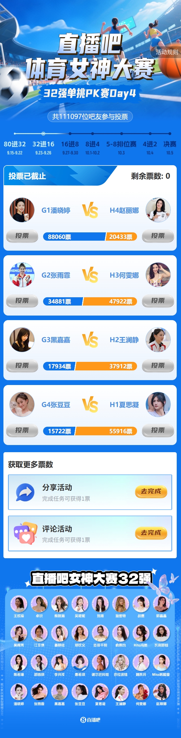 2025年『体育女神大赛』32强单挑PK赛最后一日结束,淘汰赛Day4(G组、H组)结果如下: