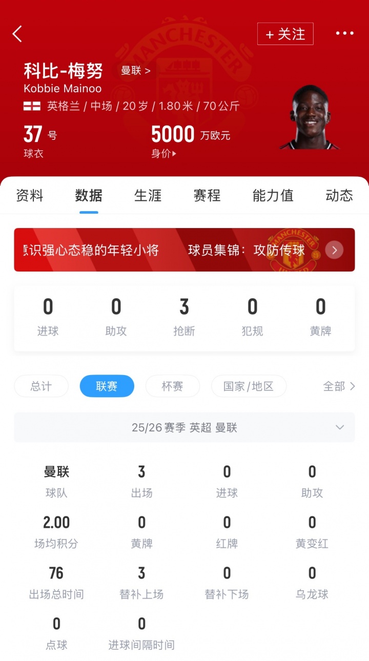 值得一提的是,据此前罗马诺等多家媒体消息,梅努在今夏因担忧出场时间曾申请租借离队,但曼联拒绝了这一提议。这名20岁的中场小将目前德转身价5000万欧元。本赛季英超出场三次全部为替补,且总计时长仅为76分钟。