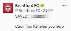 布伦特福德官方社媒对此激情发推表示:“扑出来啦!凯莱赫你是我们的英雄!!”