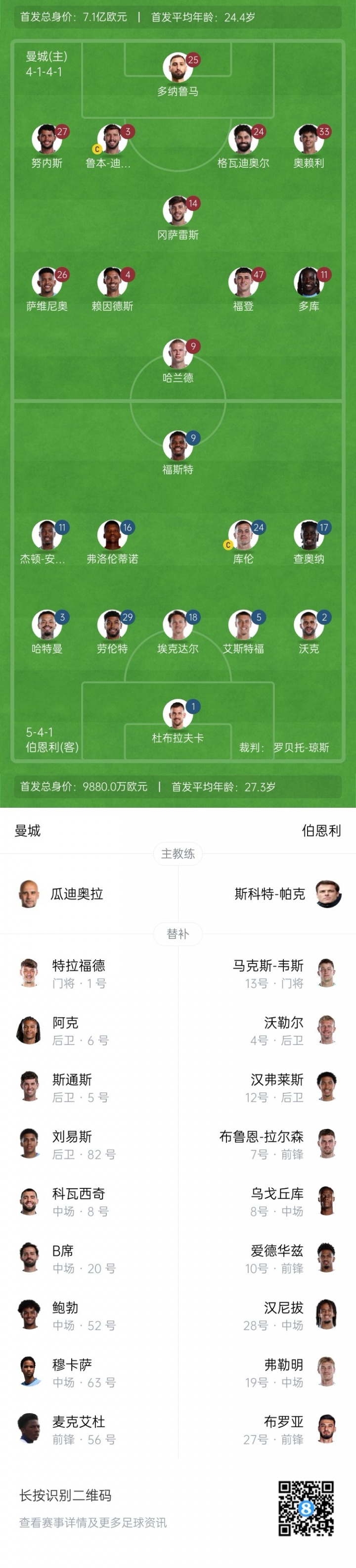 曼城首发:25-多纳鲁马、27-努内斯、3-鲁本-迪亚斯、24-格瓦迪奥尔、33-奥赖利、14-尼科-冈萨雷斯、4-赖因德斯、26-萨维尼奥、47-福登、11-多库、9-哈兰德