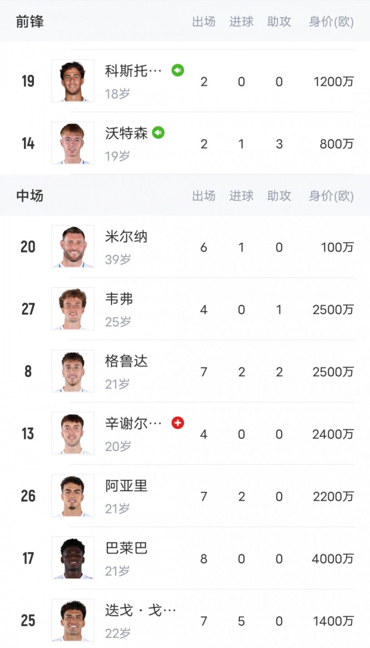 本场比赛,表现出色的有身价1400万欧的迭戈-戈麦斯、3200万欧的范赫克、1600万欧的德屈佩...