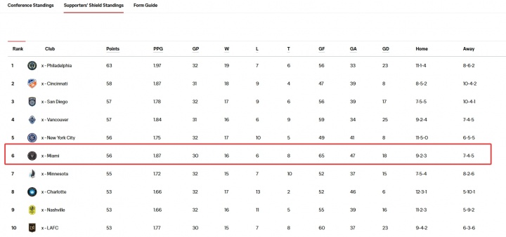 目前美职联东西区的总排名上,费城联63分第一,辛辛那提58分第二,圣地亚哥、温哥华白浪分列三四,纽约城和迈阿密国际56分排在五六位。