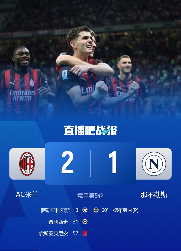 9月29日讯 北京时间2:45,意甲第5轮AC米兰vs那不勒斯,比赛在圣西罗球场打响!上半场,普利西奇精彩助攻,萨勒马科尔斯闪击破门!随后普利西奇再进一球完成传射!下半场,埃斯图皮尼安吃到红点套餐!德布劳内点射扳回一球!最终,AC米兰2-1击败那不勒斯,登顶意甲积分榜!