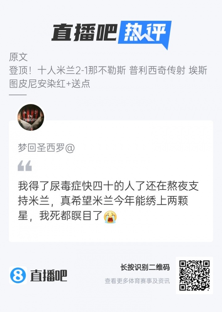 吧友【梦回圣西罗@】在AC米兰战报评论区评论:我得了尿毒症快四十的人了还在熬夜支持米兰,真希望米兰今年能绣上两颗星,我死都瞑目了。