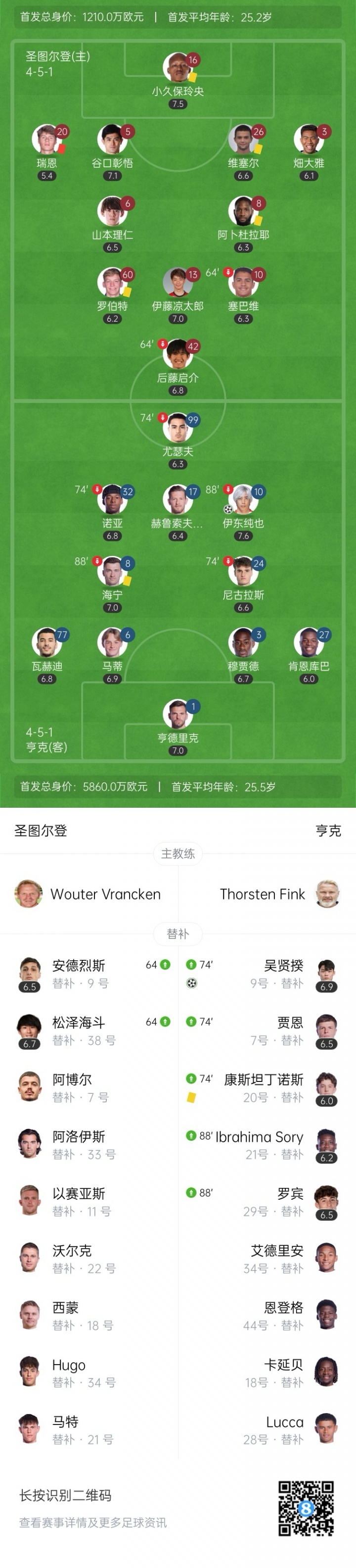 圣图尔登首发6名日本球员:16-小久保玲央(门将)、3-畑大雅(边后卫)、5-谷口彰悟(中后卫)、6-山本理仁(中场)、13-伊藤凉太郎(进攻型中场)、42-后藤启介(前锋)