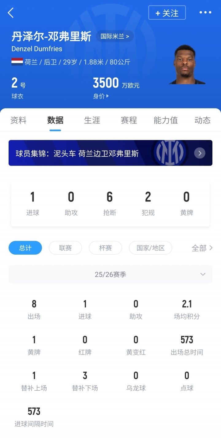 29岁的邓弗里斯本赛季代表国米出战8场比赛,打进1球,目前德转身价3500万欧。