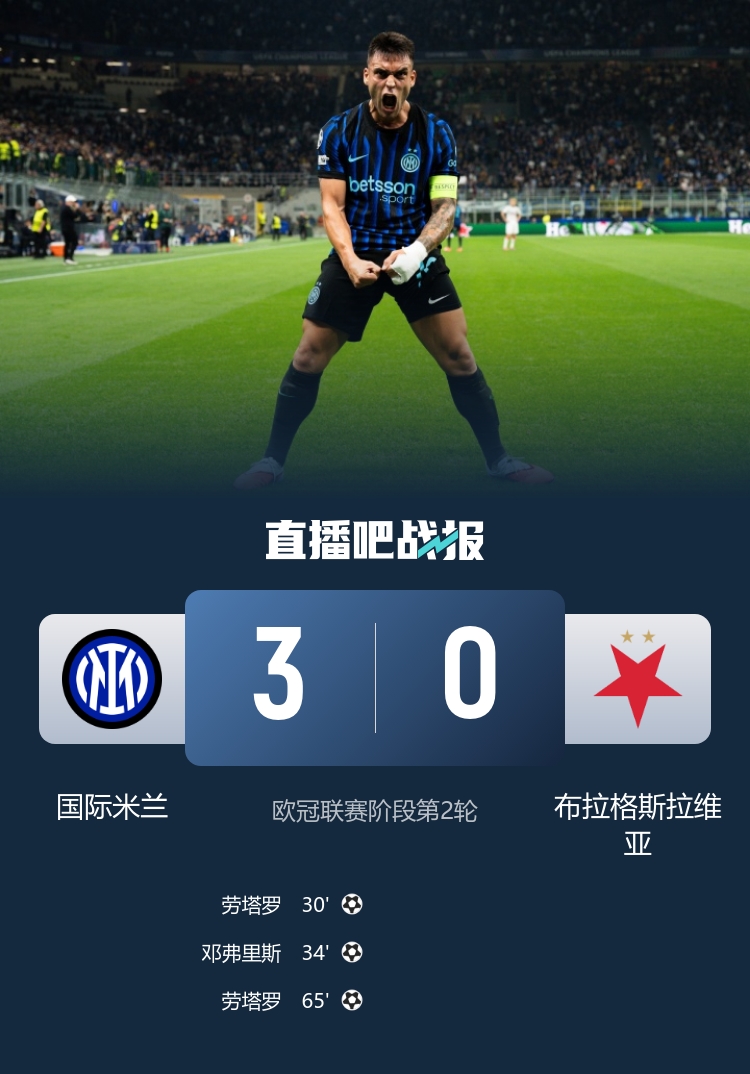 10月1日讯 北京时间10月1日凌晨3:00,欧冠联赛阶段第2轮,国际米兰坐镇梅阿查球场迎战布拉格斯拉维亚。上半场布拉格斯拉维亚门将送礼,劳塔罗打空门得手,邓弗里斯再下一城,国米暂2-0布拉格斯拉维亚;下半场劳塔罗再次进球,最终国米3-0布拉格斯拉维亚,欧冠两连胜。