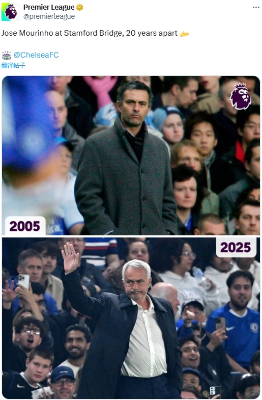 英超官推晒本菲卡主帅穆里尼奥:斯坦福桥的若泽-穆里尼奥,20年过去了……