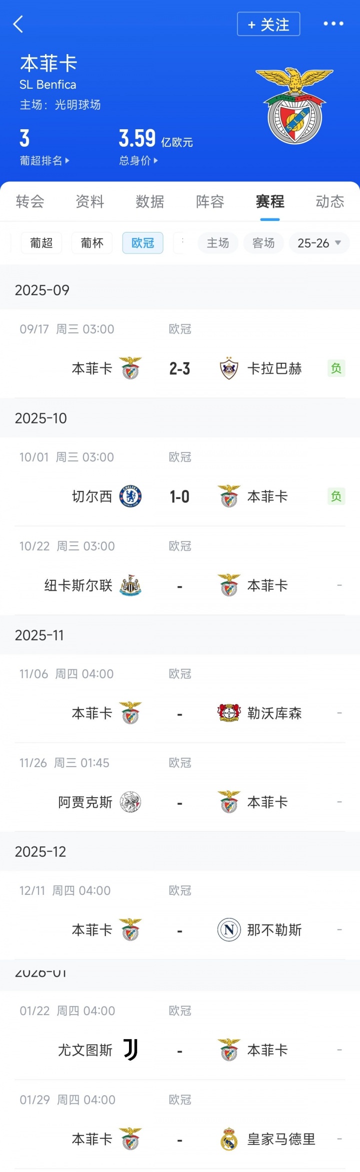 10月01日讯 欧冠联赛阶段第2轮,本菲卡0-1不敌切尔西,欧冠2连败。