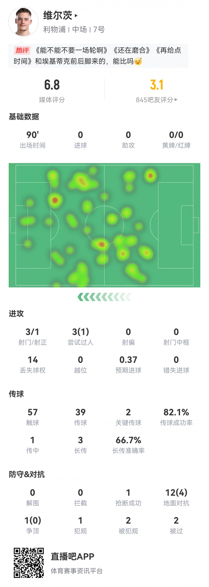 维尔茨未能展现出任何锐利度。这位德国国脚14次丢失球权,13次对抗仅赢下4次(成功率31%)。下半场一次传球失误后,他双手掩面——信心显然已遭受重挫