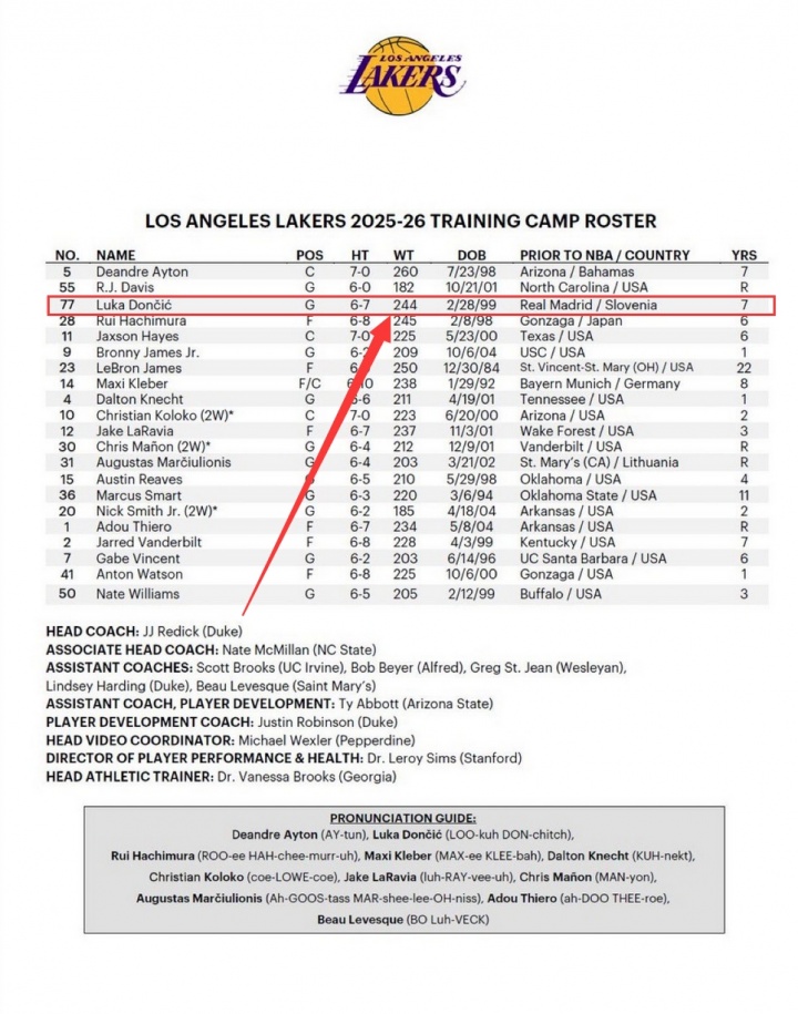 👀湖人训练营名单东契奇体重244磅 上赛季开赛230磅&最高270磅