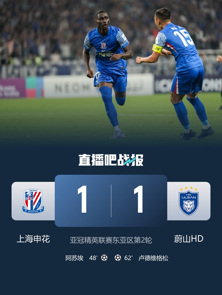 10月1日讯 北京时间10月1日20:15,亚冠精英联赛东亚区第2轮,上海申花在上海体育场迎战蔚山HD。上半场,阿苏埃错失单刀机会,双方互有攻守,但均未破门;下半场,阿苏埃补射破僵,卢德维格松扳平比分。最终,申花1-1战平蔚山HD,亚冠开局两轮不胜积1分暂居第9位,蔚山HD积4分暂居第4位。