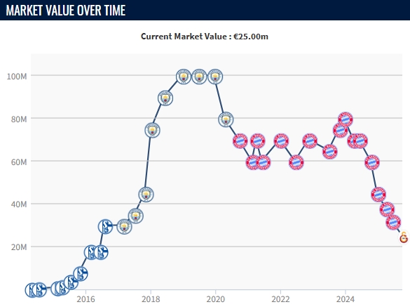 10月01日讯 德转今日更新了土超球员身价,其中今夏自由身从拜仁加盟加拉塔萨雷的萨内,身价从3200万欧跌至2500万欧。