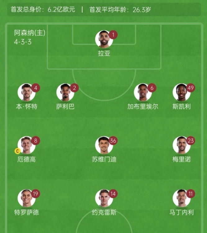 阿森纳vs奥林匹亚科斯首发:1-拉亚、2-萨利巴4-本·怀特、6-加布里埃尔、49-斯凯利8-厄德高、36-苏维门迪、23-梅里诺11-马丁内利、19-特罗萨德、14-约克雷斯