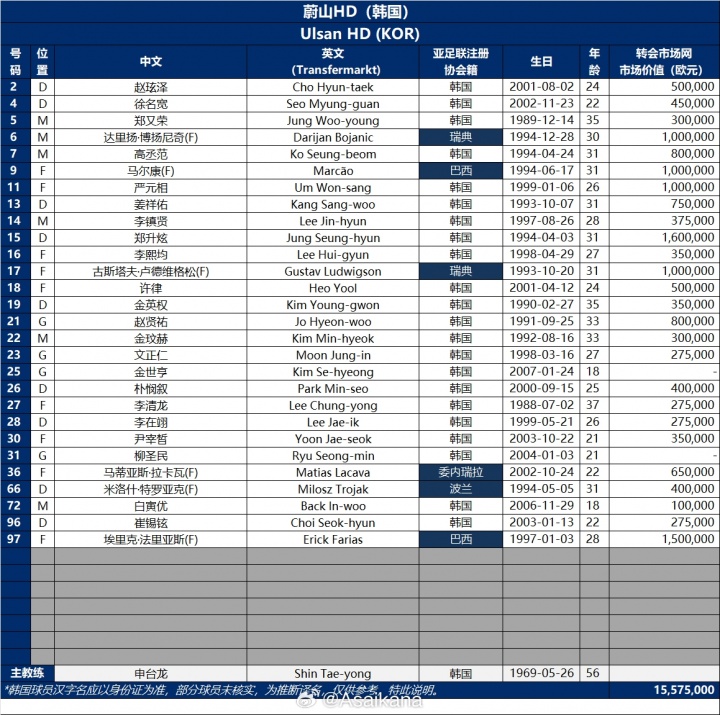 2025-26赛季亚冠精英联赛(联赛阶段)韩国蔚山HD球员名单 ​​​