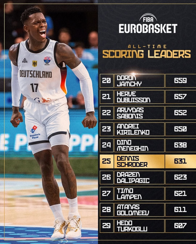 施罗德欧锦赛总得分达到631分 跻身欧锦赛历史得分榜第25位