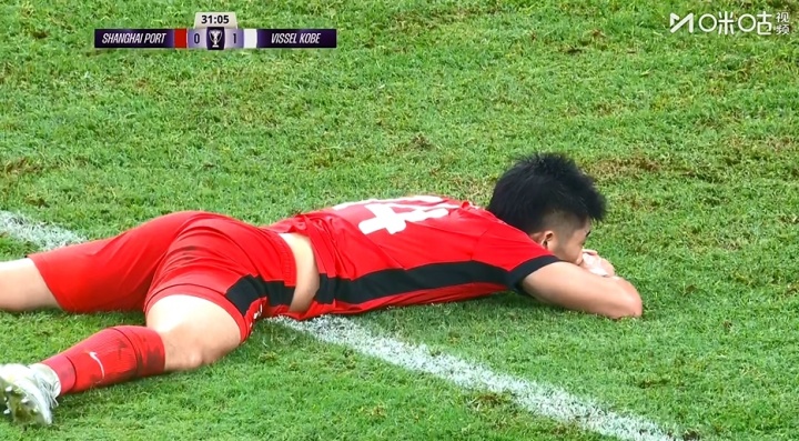 第31分钟,古斯塔沃倒钩,李圣龙近在咫尺的头球接力攻门被扑,海港仍落后。错失良机后,李圣龙十分懊恼。