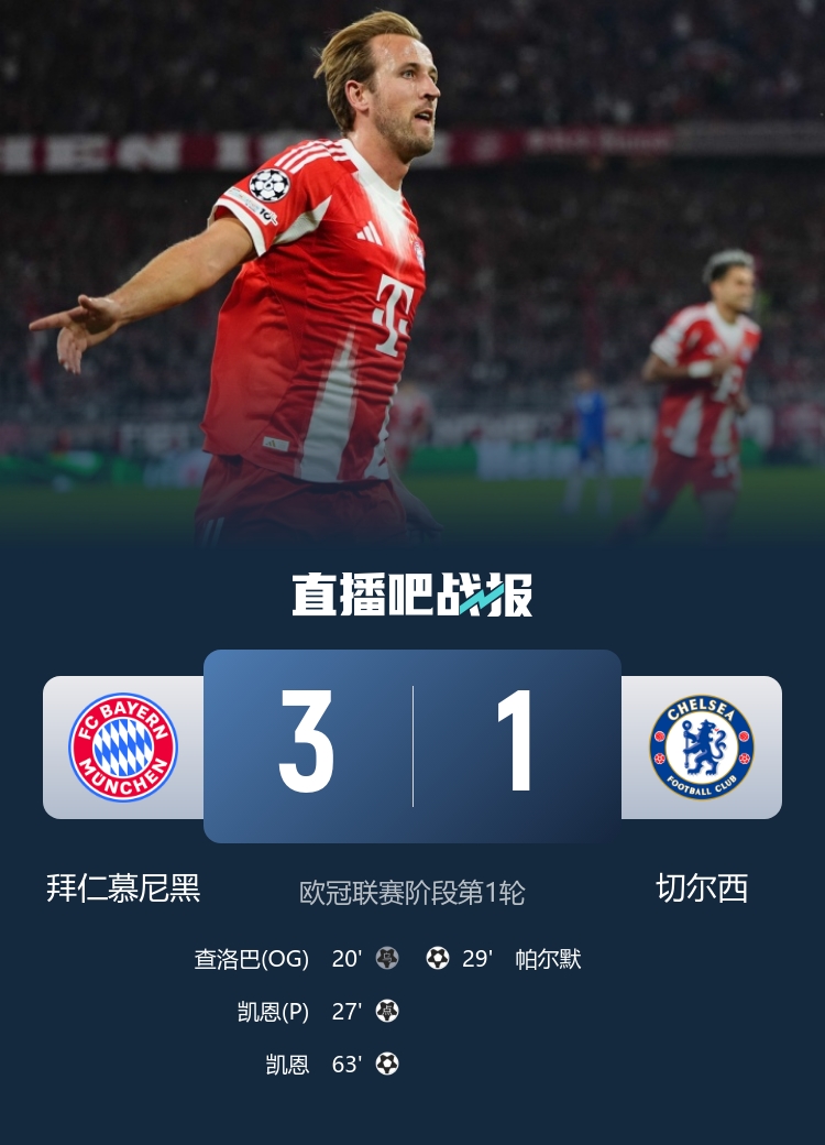9月18日讯 欧冠联赛阶段第1轮,拜仁慕尼黑坐镇主场慕尼黑安联球场迎战切尔西。上半场,查洛巴自摆乌龙,凯恩造点+点射,帕尔默破门。易边再战,古斯托失误送礼,凯恩双响,帕尔默进球被吹。最终拜仁3-1切尔西。积分榜方面,拜仁收获开门红积3分,切尔西0分。