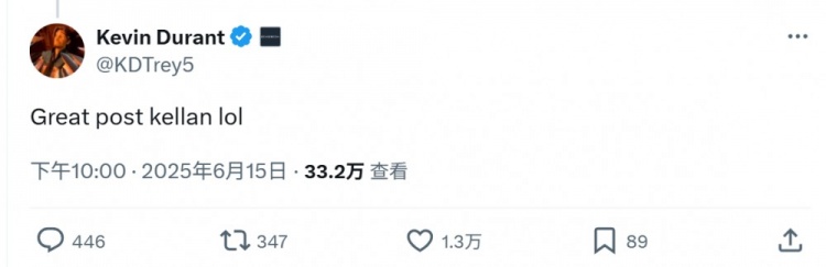 杜兰特留言:“写得太好了,Kellan,哈哈。”