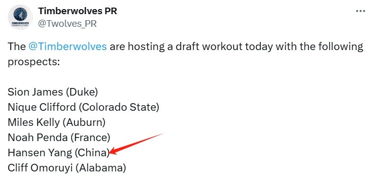 🙌👀联手华子?森林狼官方公布球队今日试训名单:杨瀚森在列