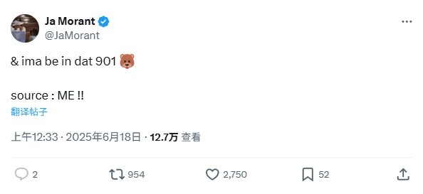 莫兰特写道:“我会留在901区(孟菲斯的区号),消息源是我自己!”并配上了一个熊头🐻的表情。