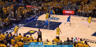 6月20日讯 NBA总决赛G6,步行者半场64-42领先雷霆。
