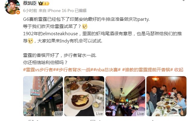 “G6赛前雷霆已经包下了印第安纳最好的牛排店准备做庆功party。等于我们昨天给雷霆试菜了?1902年的elmosteakhouse,里面的虾鸡尾酒很有意思,也是马瑟琳给我们的推荐,大家如果来Indy有机会可以试试。雷霆的香槟开好了,步行者背水一战。你还相信哈利伯顿吗?#谁教的雷霆提前开香槟#”蔡凯臣写道。
