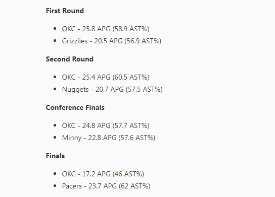难度升级!雷霆季后赛前三轮场均助攻25.3次 总决前6场降至17.2次