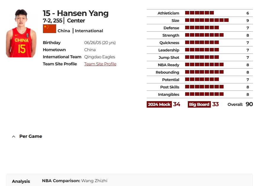 老牌选秀网站更新杨瀚森球探报告:综合评分90 模板王治郅👀