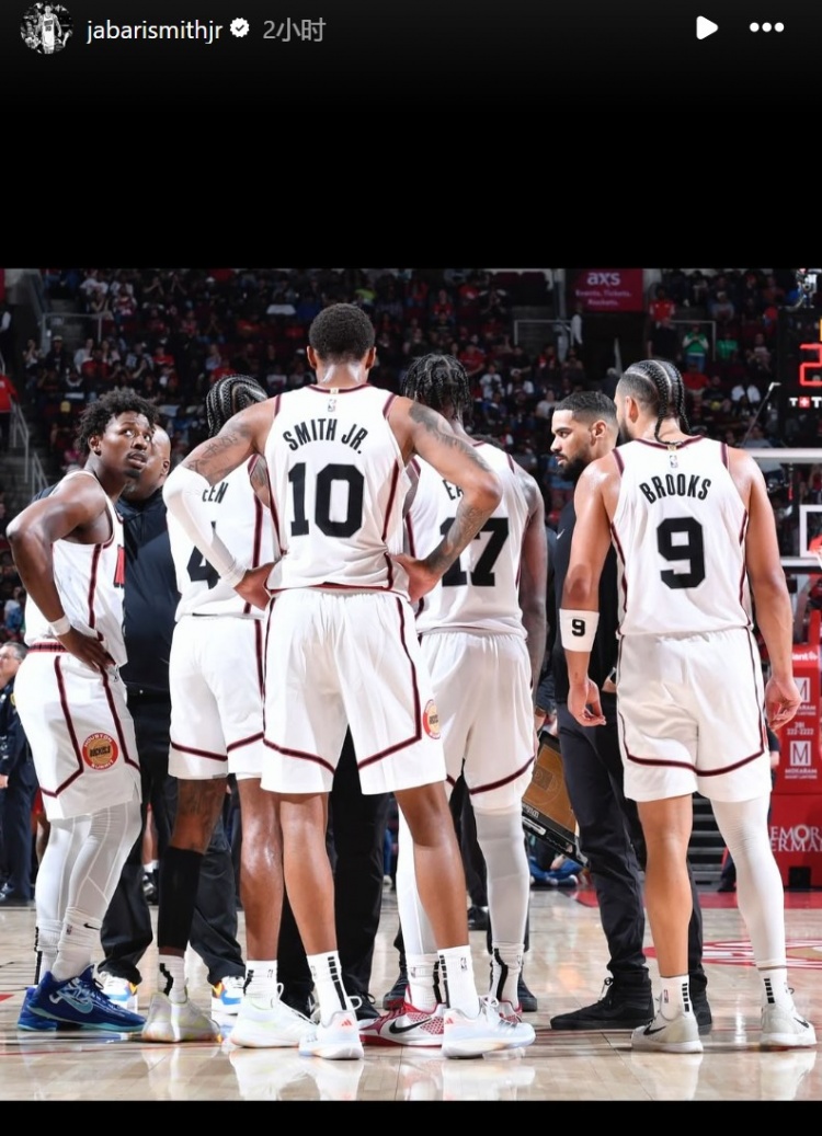 火箭前锋小贾巴里-史密斯在INS晒出了与杰伦-格林和狄龙的合照,并写道:“🤞🏼。”