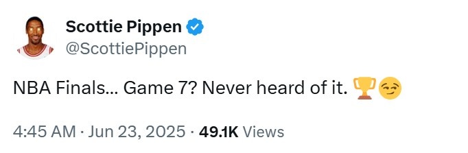 NBA名宿斯科蒂-皮蓬更推道:“NBA总决赛,,抢七?从来没有听说过🏆😏!”