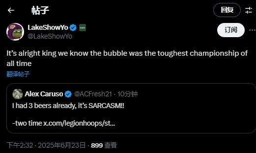 值得一提的是,湖媒LakeShowYo转发并评论道:“好的,我的王,我们知道泡泡园区是有史以来最艰难的冠军赛!”